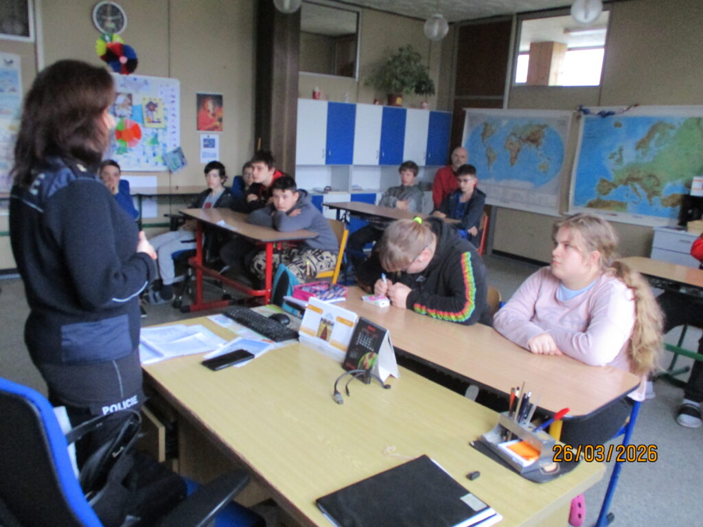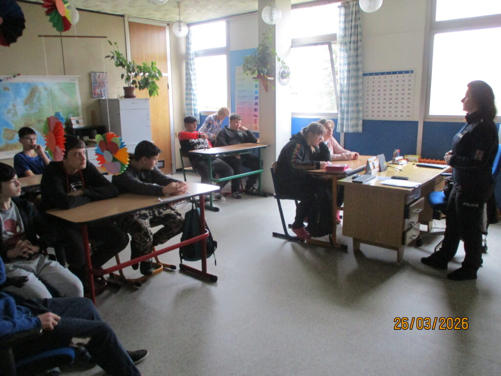 Ve čtvrtek 26. 3. 2026 naši školu navštívila mluvčí české policie paní Schindlová. Tématem besedy byla trestně-právní odpovědnost dětí a mladistvých. Paní Schindlová žáky se statistikou příbramského obvodu, co se týká trestných činů seznámila. Hovořila o jednotlivých druzích trestní činnosti (krádeže, vloupání, násilná trestná činnost, vyhrožování, loupež) a o stupních potrestání. Neopomněla připomenout nebezpečí, které hrozí na sociálních sítích (vydírání, mravnostní trestné činy). Velmi důrazně varovala před výrobou, distribucí a hlavně používáním návykových látek. Beseda byla zajímavá, žáci se dozvěděli mnoho nových informací, které ještě po skončení přednášky s vyučujícími prodiskutovali.